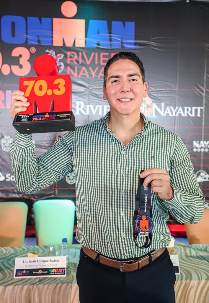 Durante su intervención, el secretario de Turismo, Juan Enrique Suárez del Real Tostado, destacó que la realización del Ironman 70.3 Riviera Nayarit se espera que genere una derrama económica de 73 millones 700 mil pesos, además de un importante impacto mediático. Subrayó la relevancia de Riviera Nayarit como un destino turístico internacional, asociado a marcas reconocidas como los Lakers, los Cowboys de Dallas y los Canucks de Vancouver, y adelantó que el próximo año se espera firmar acuerdos con los Yankees o los Dodgers.