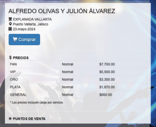 Los precios para escuchar a los exponentes populares de la música regional mexicana oscilan entre los $673 pesos, hasta $7,854.00 pesos, en preventa.