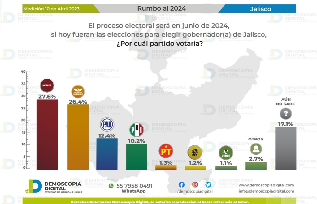 En el cuestionamiento a los ciudadanos participantes: si hoy fueran las elecciones para elegir gobernador(a) de Jalisco, ¿por cuál partido votaría? MORENA sigue estando en las preferencias de los electores y como coalición supera hasta por 7.5 puntos porcentuales al partido que actualmente ostenta el poder en la entidad, es decir, es una tendencia muy marcada hacia el cambio.