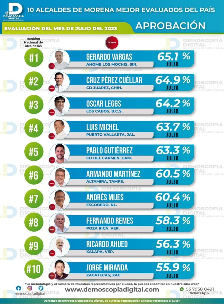 El alcalde vallartense también se coloca por encima de Salvador Zamora de Tlajomulco de Zúñiga, Juan José Frangie de Zapopan, Sergio Chávez de Tonalá, Josué Ávila de Ocotlán, Citlalli Amaya de Tlaquepaque, entre otros, a quienes supera hasta por más de 10 puntos porcentuales. Y desde luego, también es el alcalde morenista mejor calificado en la entidad.