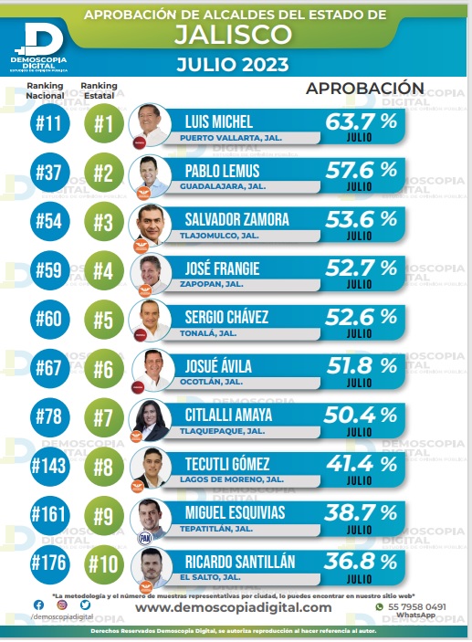 Además, el Profe Michel de nuevo fue colocado como el alcalde mejor calificado del estado de Jalisco con un considerable margen sobre el segundo lugar en esta escala, el alcalde de Guadalajara, Pablo Lemus, que tuvo una calificación de 57.6 por ciento.