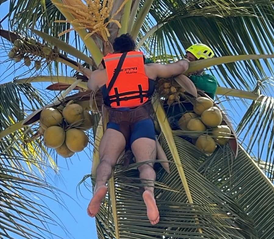 El afectado fue identificado como Guillermo Lozano, de 27 años, originario de Monterrey, Nuevo León, y hospedado en el hotel Riu Jalisco. El hombre permanecía suspendido a una altura aproximada de ocho metros sobre una palmera ubicada en el condominio Quinta del Mar.