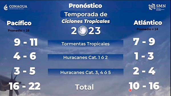 Indicó que de acuerdo con la información disponible emitida por la Colorado State University y por el Servicio Meteorológico Nacional este año se espera un total de entre 16 y 22 ciclones tropicales en el Pacífico; en tanto que en el Océano Atlántico entre 10 y 16 y, al menos, se podrían presentar dos huracanes muy intensos, de categoría entre tres y cinco.