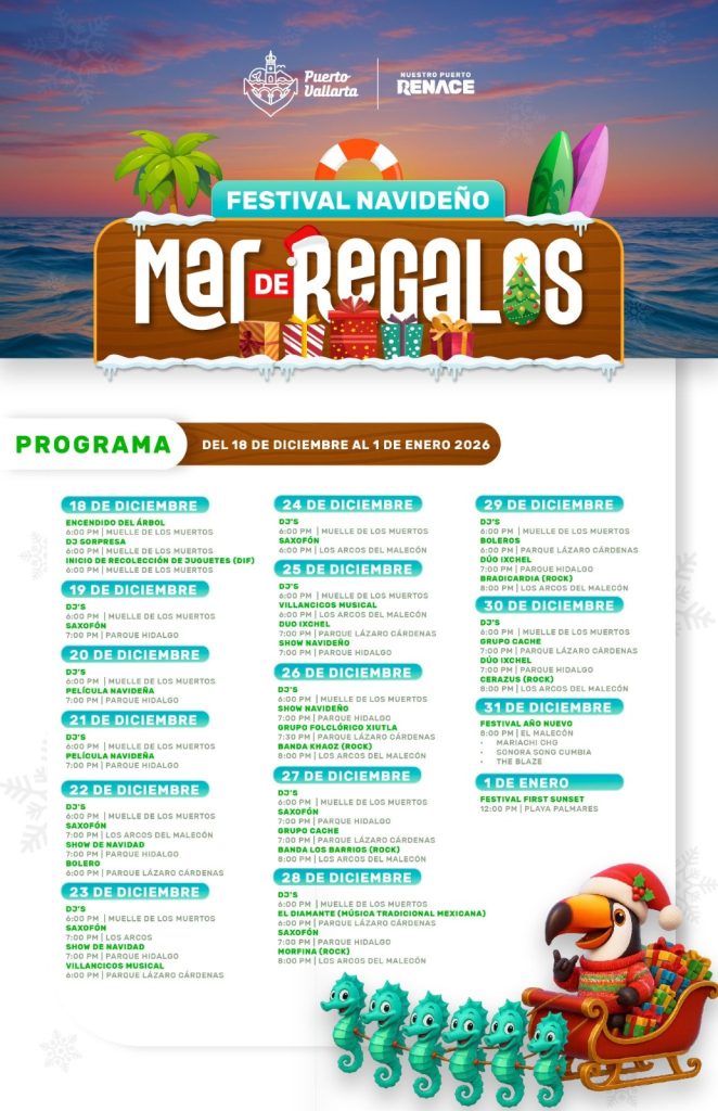El programa completo ya está disponible en las redes sociales del Gobierno Municipal de Puerto Vallarta, así que no te pierdas la oportunidad de unirte a la celebración y disfrutar de un mar de regalos con la familia y amigos.