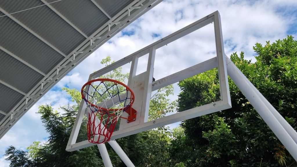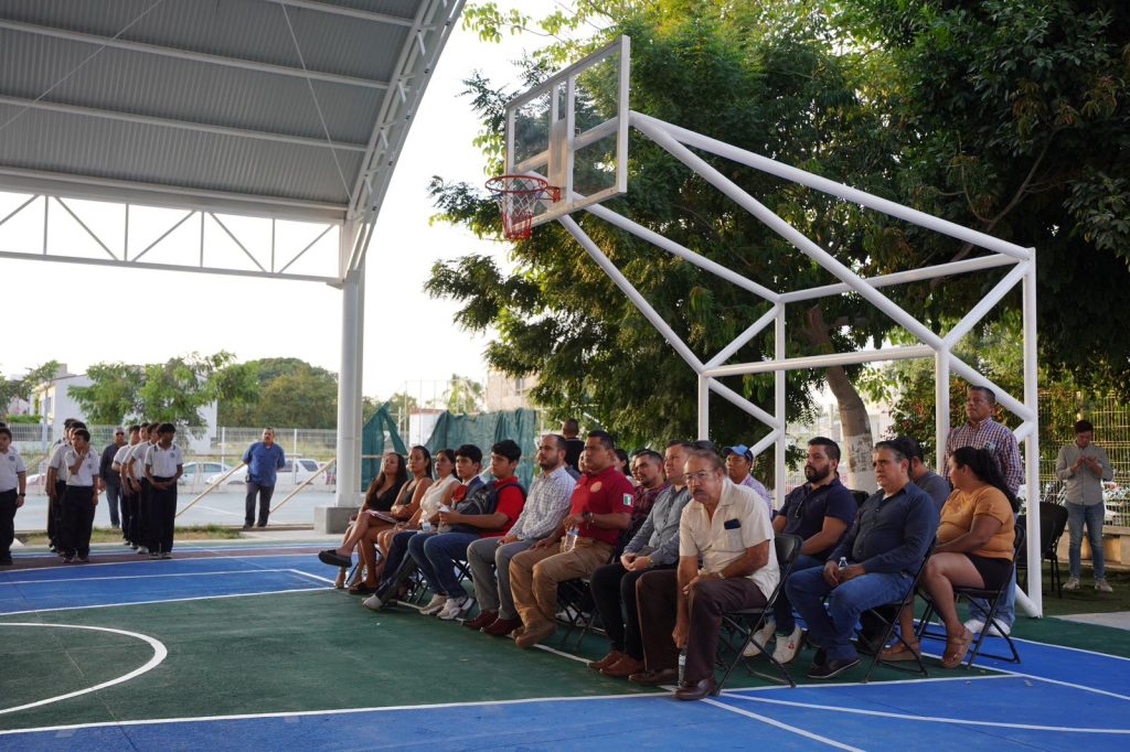Para realizar esta obra se habilitaron y montaron 12 columnas, bajantes de tubería de PVC, canalón fluvial, instalación de lámina de filtro y se colocaron canastas y porterías, todo ello para una población beneficiada de más de mil 300 alumnos, además de sus familiares y el personal docente.