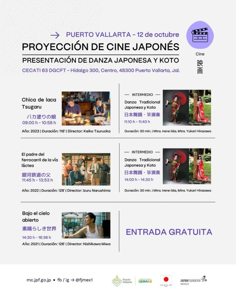 En el auditorio del CETACI 63, a partir de las 9:00 horas del sábado 12 de octubre, se tiene contemplado la proyección tres películas: “Chica de laca Tsugaru”, “El padre del ferrocarril de la vía láctea” y “Bajo el cielo abierto”, además de deleitar a los asistentes con danza tradicional Japonesa y Koto.