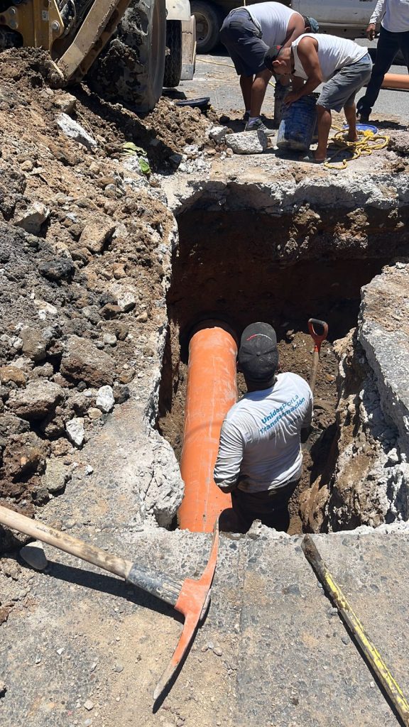 Por su parte, las cuadrillas de Distribución de Agua Potable, intervinieron la línea de bombeo del Pozo 27 ubicado en la calle Camino a Playa Grande y Mar de Cortés, la cual presentaba una fuga.